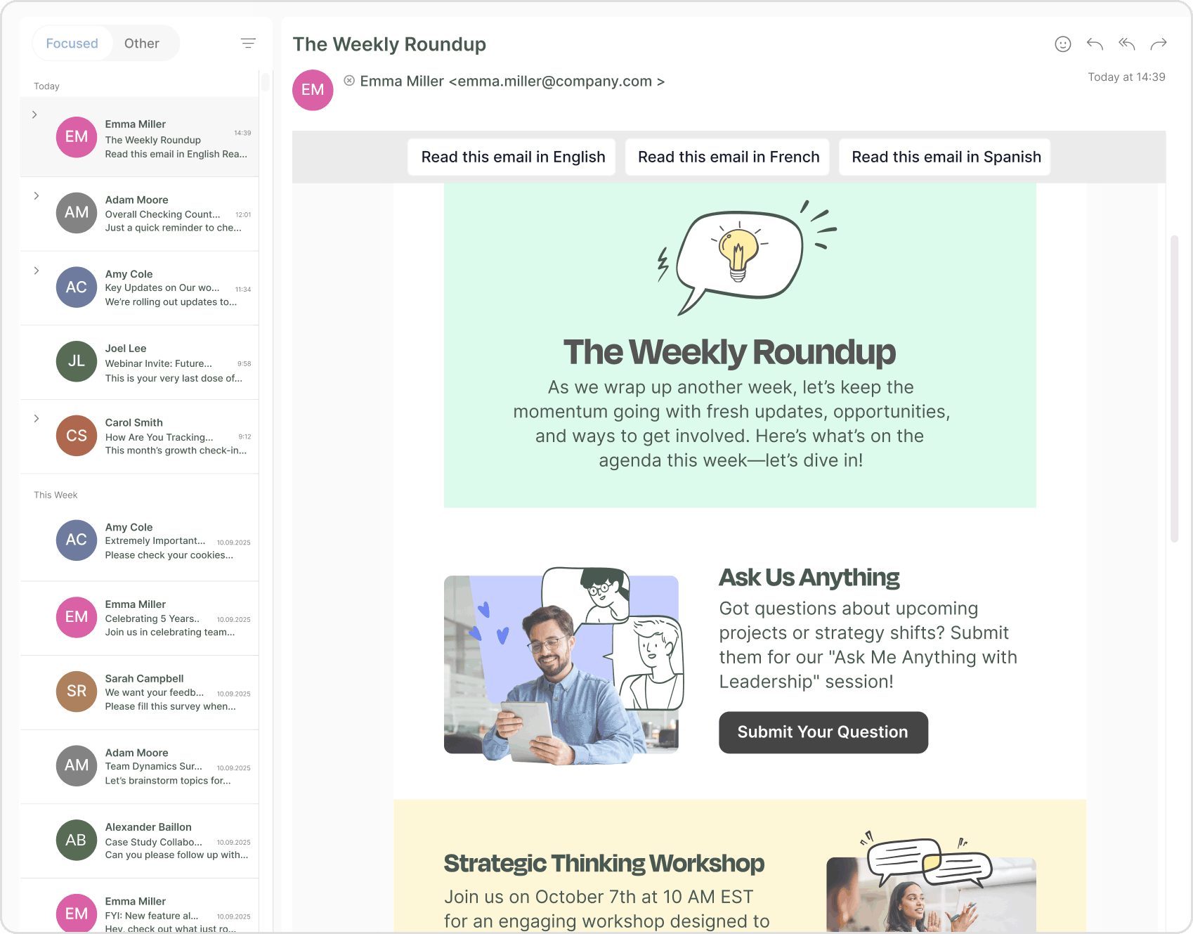 Create on-brand employee emails fast, with a partner who’s always there to help.